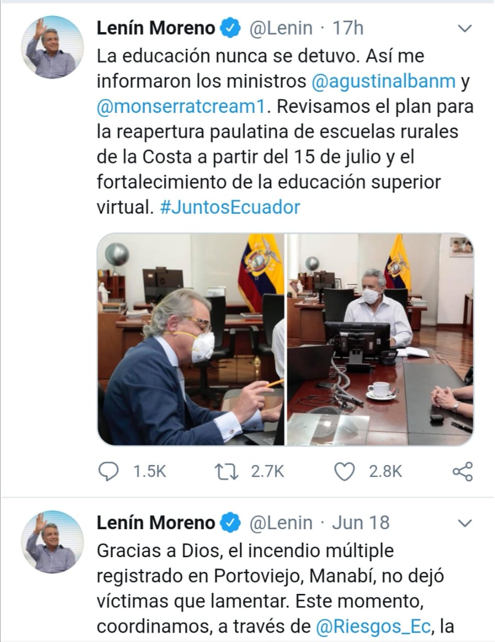 Moreno enfatizó lo siguiente: “La educación nunca se detuvo. Así me informaron los ministros Agustín Albán y Monserrat Creamer. Revisamos el plan para la reapertura paulatina de escuelas rurales de la Costa a partir del 15 de julio”.
